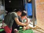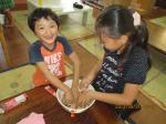 買物は女の子4年生の女の子と1年生の男の子の2人、ピザ生地づくりは男の子2人と2年生の女の子。