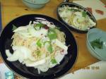 材料は麺、タコ、生ハム、玉ねぎ、シーチキン、カニ缶、青ジソ(学童の庭に自生)。