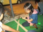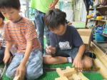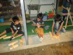 木と木とくっつけて釘をうって何やら作っていきますが、木を押さえてもらわないと釘が打ちにくいので、自然と助け合いが生まれます。