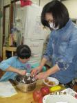 包丁の使い方を教え、2年生のMちゃんと4年生のKちゃんが刻むのを見せて、だんだん慣れてくると上手に刻めるようになっていきました。