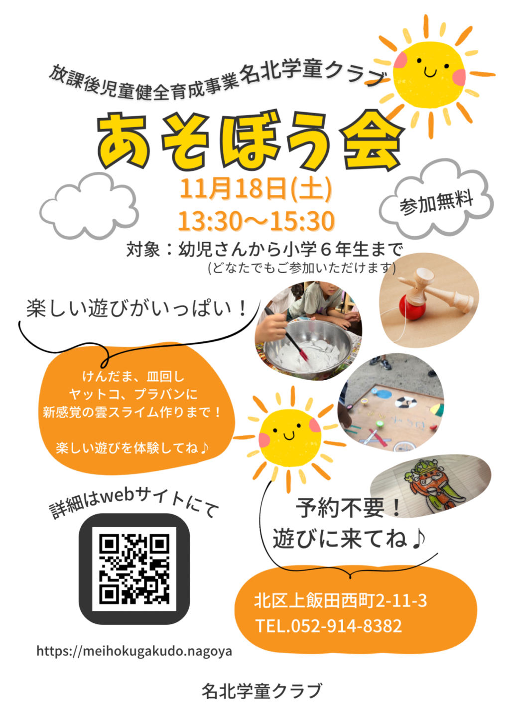 新着情報 2025 あそぼう会のお知らせ 日中もずいぶんと涼しく過ごしやすくなってきましたね☆ 普段学童で遊んでいる遊びを体験できるイベント【あそぼう会】を開催します♪ ◇日時◇ 2025.11.8(土) 13:30~15:30 ◇場所◇ 名北学童 ヤットコ、コマ、皿回し、プラ... 2025.10.10 新着情報